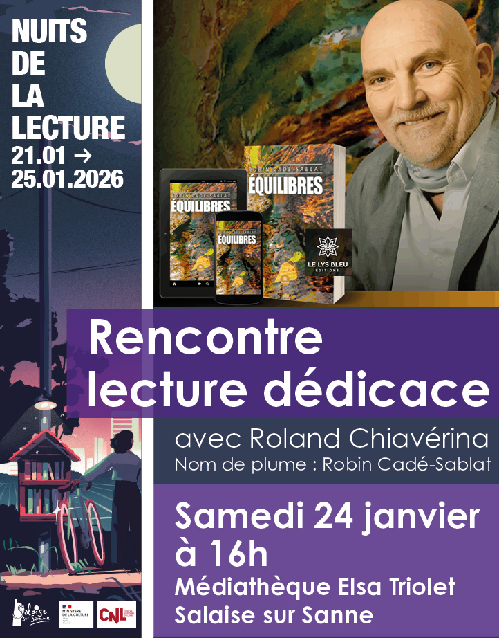 Dans le cadre des nuits de la lecture Rencontre lecture dédicace avec Roland Chiavérina - Samedi 24 janvier 2026 à 16h Roland Chiavérina (de son nom de plume : Robin Cadé-Sablat), poète salaisien, explore dans ses textes les paysages intérieurs, les gestes du quotidien et la façon dont les mots peuvent ouvrir des lieux de…