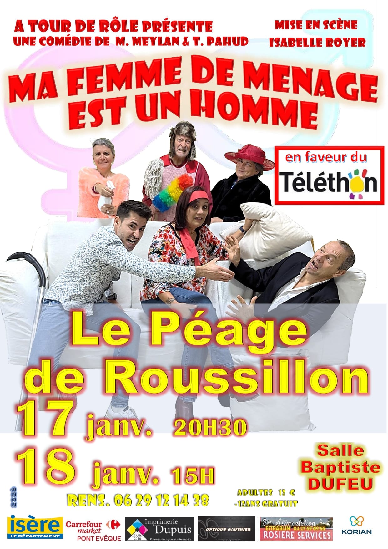 Ma femme de ménage est un homme A TOUR DE RÔLE PRÉSENTE UNE COMÉDIE DE M. MEYLAN & T. PAHUD MISE EN SCÈNE : ISABELLE ROYER Salle Baptiste DUFEU - Le péage de Roussillon ADULTES 12 € - de 12 ans : GRATUIT La totalité des bénéfices sera reversée à l'afm téléthon, pour participer au…
