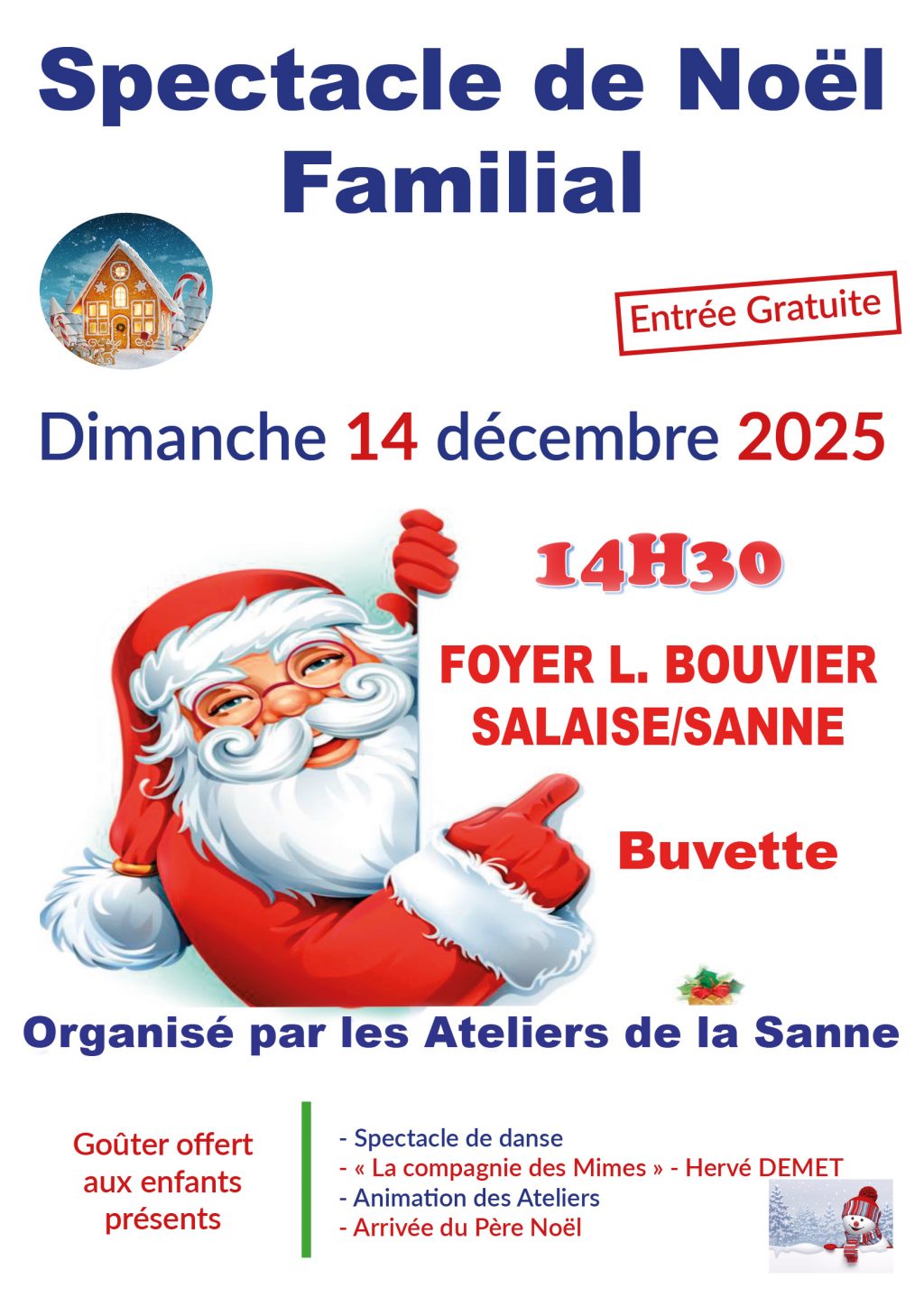 Organisé par les Ateliers de la Sanne Dimanche 14 décembre 2025 à 14h30 FOYER L. BOUVIER – SALAISE/SANNE Goûter offert aux enfants présents – Spectacle de danse – « La…