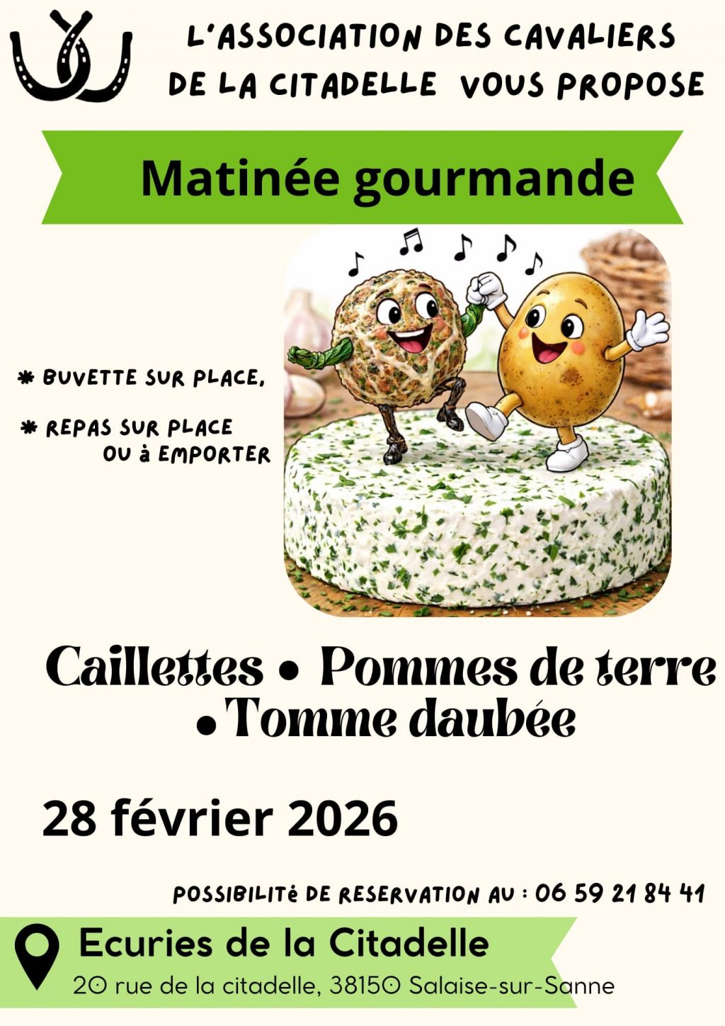L’ASSOCIATION DES CAVALIERS DE LA CITADELLE VOUS PROPOSE une matinée gourmande. Caillettes • Pommes de terre •Tomme daubée 28 février 2026 Ecuries de la Citadelle 20 rue de la citadelle,…