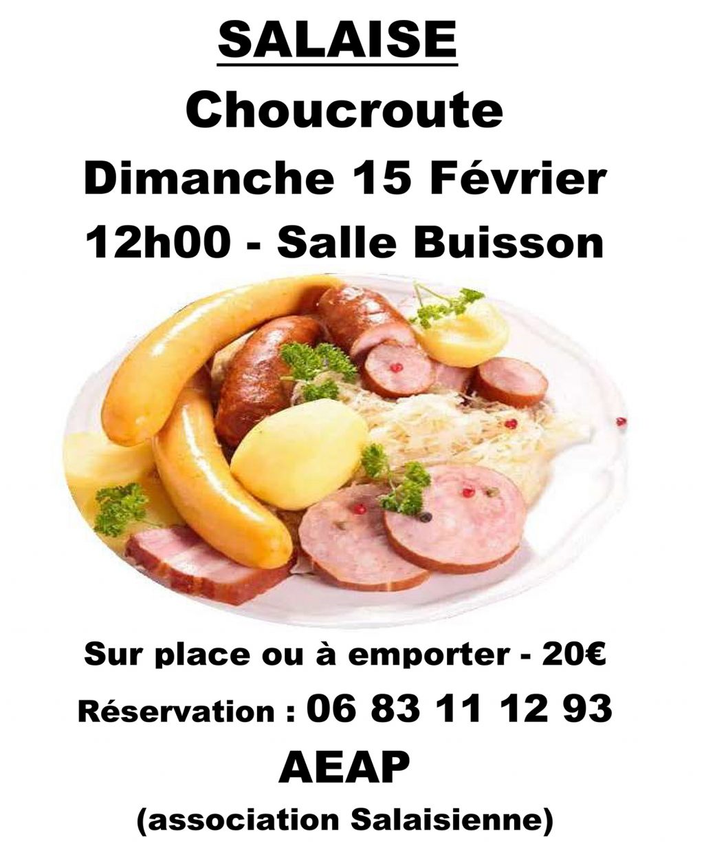 Choucroute Dimanche 15 Février 12h00 – Salle Buisson Sur place ou à emporter – 20€ Réservation : 06 83 11 12 93 AEAP (association Salaisienne)
