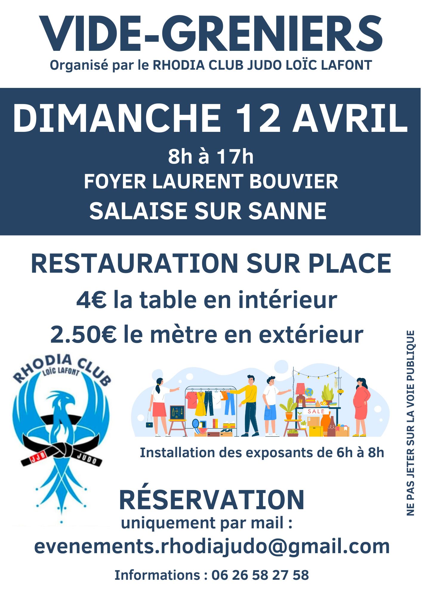 DIMANCHE 12 AVRIL de 8h à 17h FOYER LAURENT BOUVIER SALAISE SUR SANNE RESTAURATION SUR PLACE 4€ la table en intérieur / 2.50€ le mètre en extérieur RÉSERVATION uniquement par…