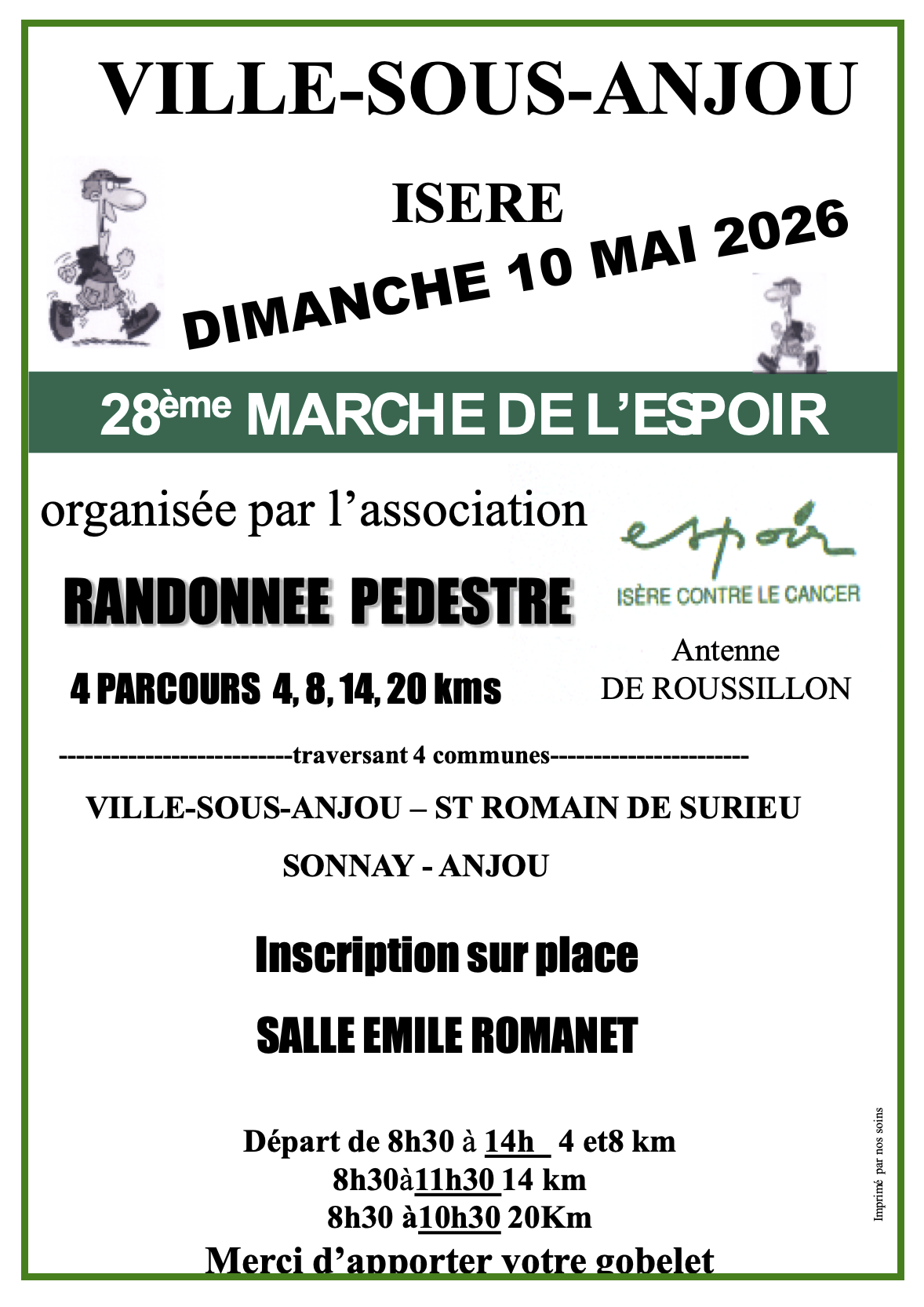organisée par l’association Espoir Isère contre le Cancer Antenne de Roussillon Randonnée pédestre traversant 4 communes 4 parcours - 4, 8, 14, 20 kms VILLE-SOUS-ANJOU –ST ROMAIN DE SURIEU SONNAY…