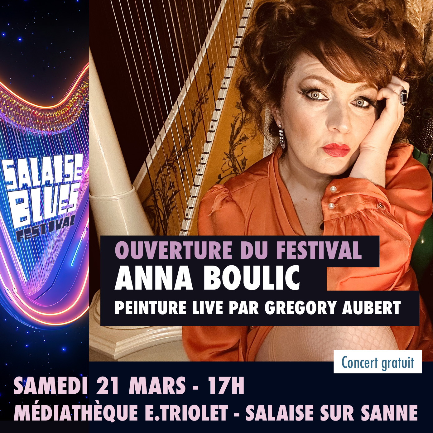 Concert gratuit dans le cadre du Salaise Blues Festival 2026 OUVERTURE DU FESTIVAL AVEC ANNA BOULIC (harpe et chant)À 17H ACCUEILLIE PAR LA MÉDIATHÈQUE ELSA TRIOLET Ce sera également l’occasion de découvrir le travail de l’artiste Grégory Aubert en direct live. 18 Rue Pierre Avit Nicolas 38150 Salaise sur Sanne