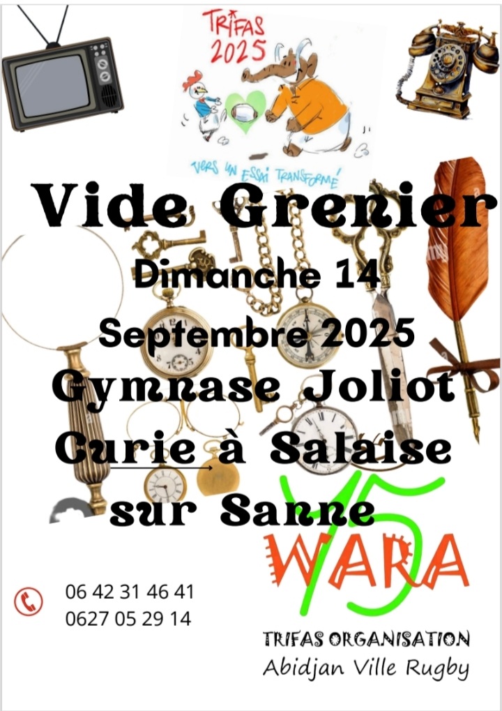 DIMANCHE 14 septembre 2025 de 6h à 17h aux abords du Gymnase Joliot Curie à Salaise Sur Sanne 3 euros le M/L extérieur Organisé par l'Association WARA 15 : 0642314641 ou 0627052914