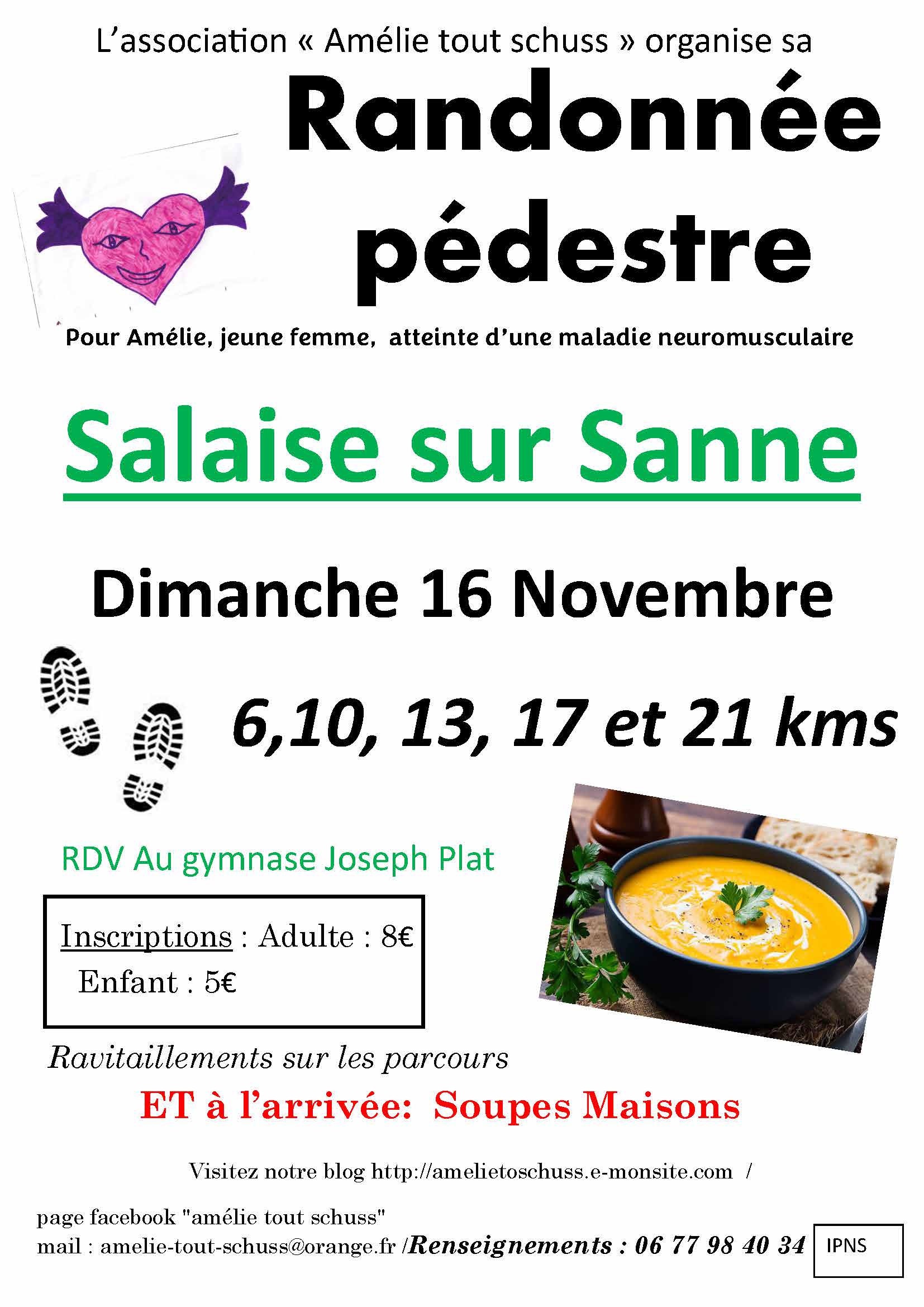 L’association « Amélie tout schuss » organise sa Randonnée pédestre pour Amélie, jeune femme, atteinte d’une maladie neuromusculaire. Salaise sur Sanne Dimanche 16 Novembre RDV Au gymnase Joseph Plat 6,10, 13, 17 et 21 kms Inscriptions : Adulte : 8€ / Enfant : 5€ Ravitaillements sur les parcours ET à l’arrivée: Soupes Maisons Pour Amélie,… Lire la suite