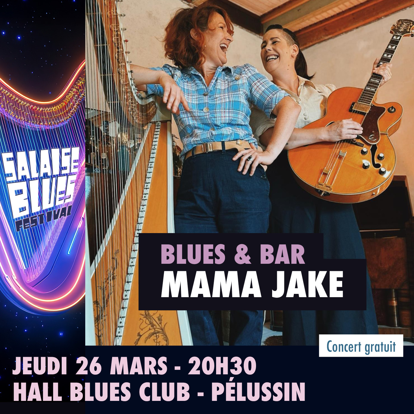 Mama Jake est un duo de blues et swing à l’esthétique cabaret des années 30, mené par Ady (guitare, chant, percussions, lauréate du Challenge Blues Français 2024) et l’Australienne Anna Boulic (harpe et chant).
