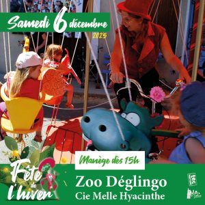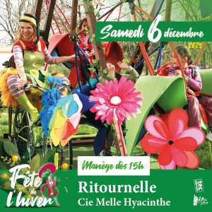 > Mlle Hyacinte et Cie avec Zoo Deglingoo, manège enchanteur et coloré, joyeusement accompagné par des comptines et chansons pour enfants, et La ritournelle, une mini grande roue à pédales pour les enfants de 3 à 10 ans.