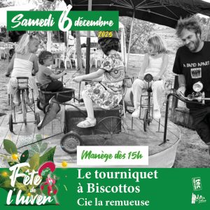 > Le tourniquet à Biscottos de la compagnie La Remueuse : un manège unique qui ne tourne que grâce à la force des biscottos pour le plus grand bonheur des plus petits. Un tourbillon joyeux, léger, et plein de surprises pour les rêveurs et rêveuses de 2 à 8 ans !