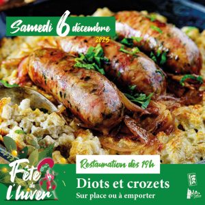 • En soirée, repas (diots crozets pommes de terre) sur place ou à emporter, tickets à 12 euros en vente en mairie (jusqu’au 4 décembre) et le 6 décembre à partir de 15h30 au stand repas.