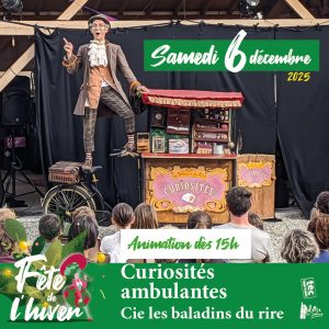 > Curiosités ambulantes – Cie les baladins du rire : Ce colporteur, magicien enchanteur déambule avec son cabinet de curiosités à roulettes. Au fil de ces rencontres, il accroche les passants et déploie son triporteur. Il ne manquera pas une occasion pour sortir ses collections d’illusions, de poèmes, d’objets étranges, de bibelots de famille…
