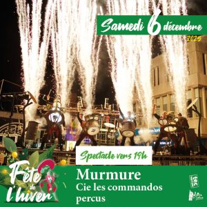 > Murmure – Cie Les commandos percus : À la croisée de la musique, du théâtre de rue et de l’art pyrotechnique, Murmures est un voyage sensoriel où se rencontrent deux langages aussi élémentaires que puissants : le son et le feu, en créant un dialogue subtil entre les éléments.Chaque coup de baguette, chaque frappe sur les peaux se change en une expression poétique, comme un secret qui se révèle et se déploie dans l’espace.